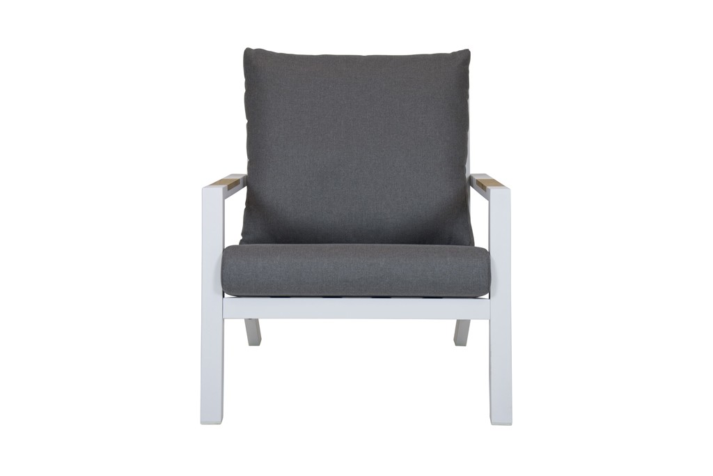 De Ascon loungestoel is een eigentijds model met strakke lijnen. Deze serie Ascon heeft een zeer goede zitvorm door de dikke kussens, welke zijn uitgevoerd in Olefin stof. Het frame is van onderhouds vriendelijk aluminium, in de kleur wit. De armen hebben een teakhouten inleg en maken deze loungeserie uniek. De stoel is eenvoudig te monteren met bijgeleverd materiaal.
