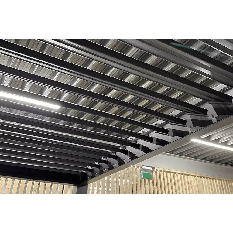 Het frame van de overkapping is gemaakt van aluminium met een beschrmende antraciete poedercoating er over heen. De lamellen zijn van metaal en hier zit ook ee beschermende antractiete peodercoating overheen. Met een sopje en een zachte borstel is de overkapping makkelijk af te doen en dus heelonderhoudsvriendelijk.