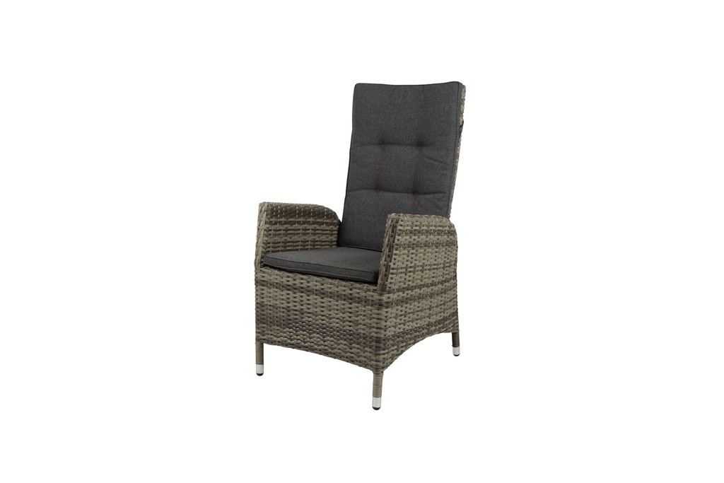 De Manhattan gasveer stoel is traploos verstelbaar en leverbaar in diverse kleuren. De stoel heeft een hoge rugleuning en zowel een rug- als zitkussen. Dit komt ten goede aan het zitcomfort. De standenstoel heeft een aluminium frame met daar over heen een dubbel halfronde grijze wicker.
